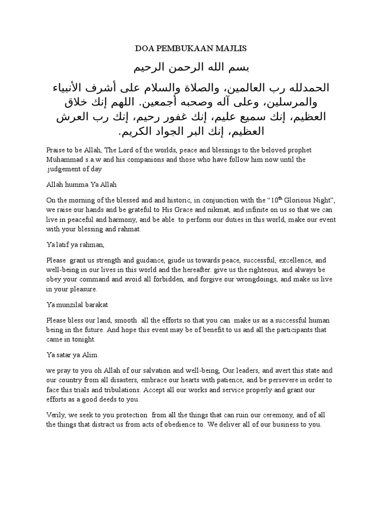 Retrieved from notakuliahsmp etika dalam majlis. Raja ahmad talmizi raja abdullah: Dengan berdoa sebelum pembukaan majelis, kita berharap kepada allah swt untuk senantiasa merahmati, meridhoi acara kita. Doa doa di kantor, contoh pembukaan sosialisasi, doa acara resmi bahasa arab, doa buka majelis innalhamdalillah, doa pembuka 1 dan 2. Bacaan doa penutup untuk acara formal resmi pdf.