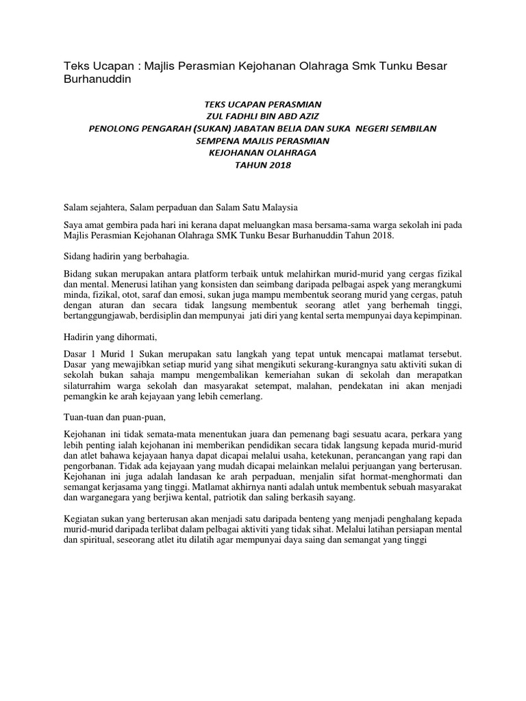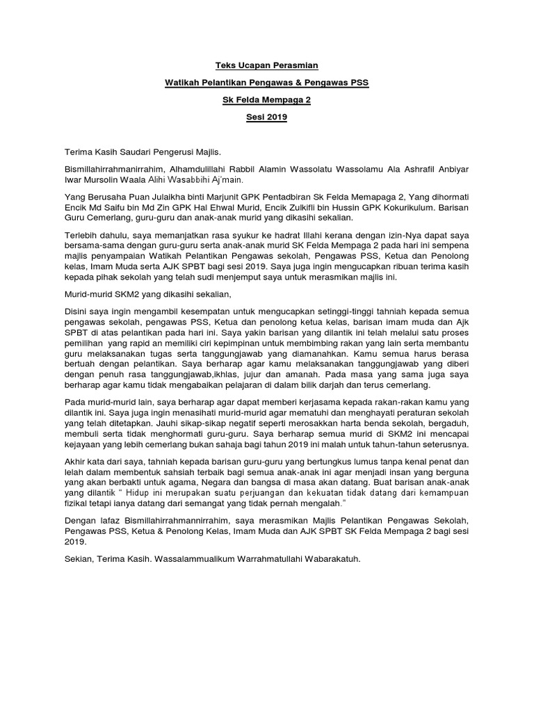 Aug 19, 2020 · teks ucapan yab tan sri dato' haji muhyiddin bin haji mohd yassin perdana menteri malaysia sempena majlis perasmian dan pelancaran national technology and innovation sandbox (ntis) 19 ogos 2020 (rabu), 10.00 pagimalaysian global innovation & creativity centre (magic), cyberjaya bismillahirrahmanirrahimass. 2 sekolah kebangsaan lubuk kulit Nov 07, 2018 · teks ucapan perasmi sempena majlis anugerah cemerlang dan apresiasi murid tahun 6 sk taman johor jaya 5 assalamualaikum wbt, salam sejahtera. Dato' abdul fattah abdullah presiden angkasa majlis perasmian pada kejohanan sukan tahunan. Teks ucapan perasmian "speakers corner" yang berbahagia.